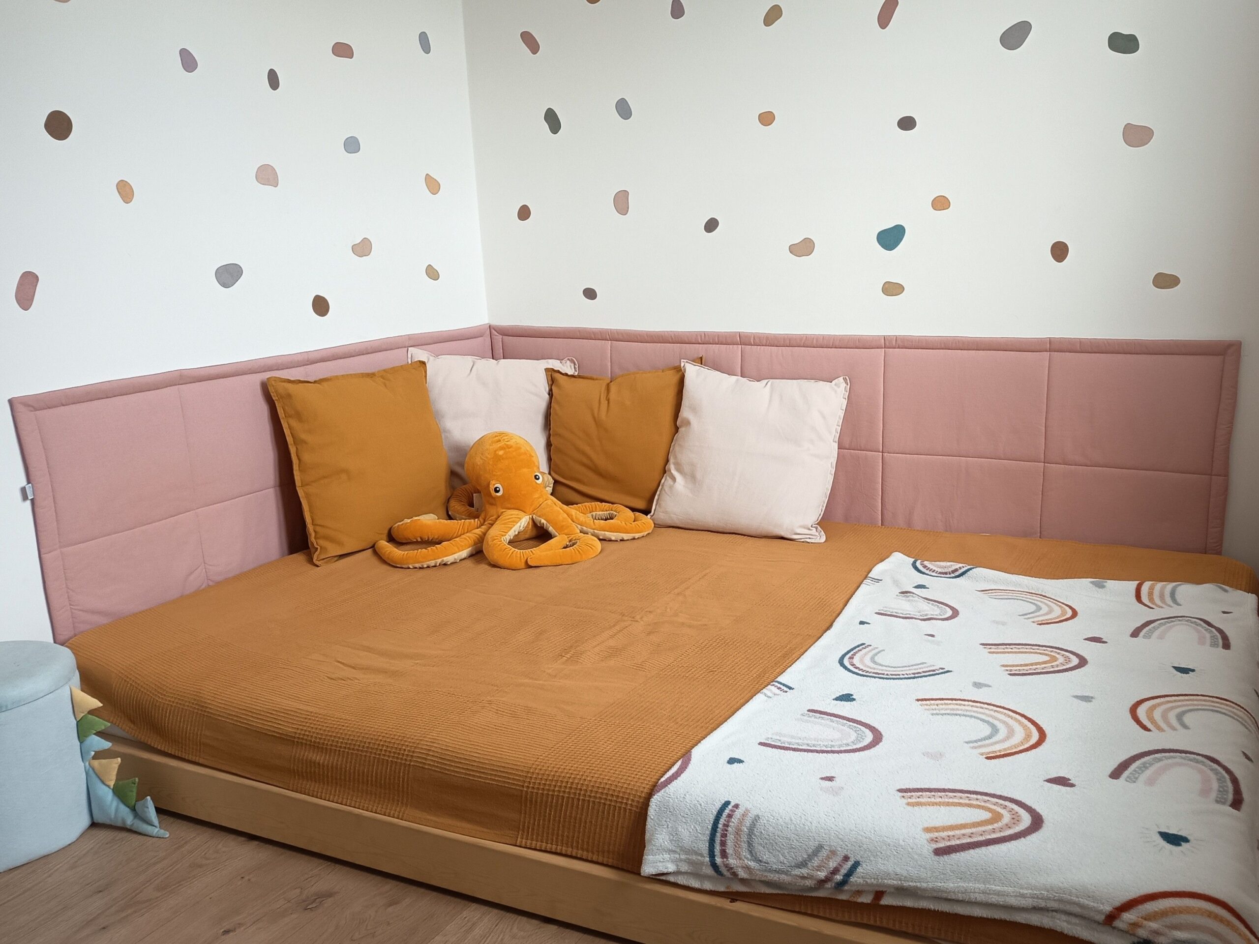 Rögzítése kétféleképpen történhet: 1.puha tépőzár részt varrok a falvédő hátára, a kemény tépőzár részt pedig a falra kell rögzíteni. – Ez a legegyszerűbb megoldás, és így szépen egyenletesen lehet a falra rögzíteni. 2. Akasztókat varrok a hátára, amikkel a falra kampózhatók.
